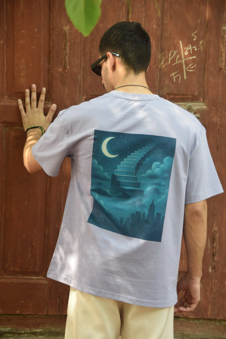 The soft lilac backdrop sets a calm, almost meditative tone. At its center, a dreamlike staircase floats upward into moonlit clouds — a symbolic journey for those who believe in growth, imagination, and moving beyond limits.